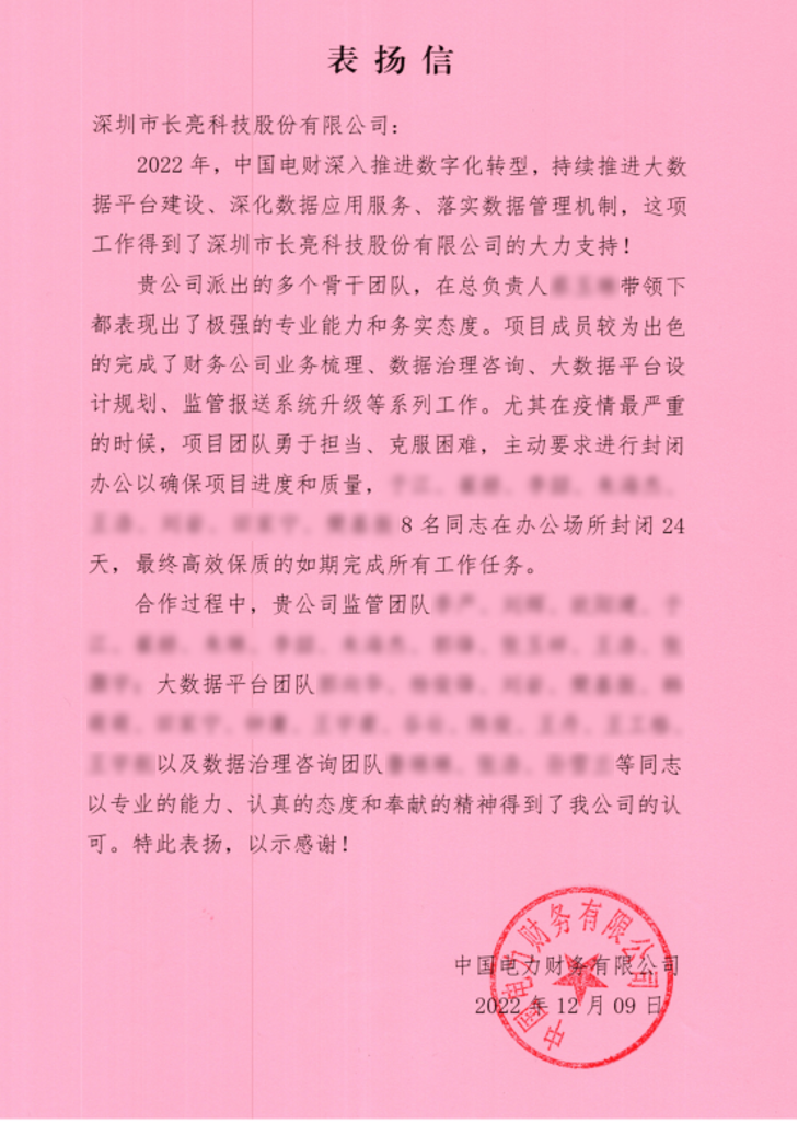 近日,長亮科技收到一封來自中國電力財務公司(下稱“中國電財”)的表揚信。信里中國電財對長亮科技2022年在其大數據體系建設中的突出貢獻表示認可和感謝,尤其是面臨疫情侵襲下的重重難關,長亮科技項目團隊所展現出來的勇于擔當和刻苦拼搏精神,更是得到了中國電財的高度贊揚。