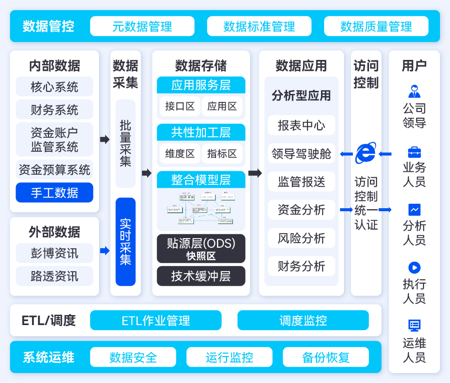 建成內部管理應用、實時監測應用、監管報送應用、外部數據應用四大類應用,滿足業務運營分析、監管報送等多數據應用場景需求。