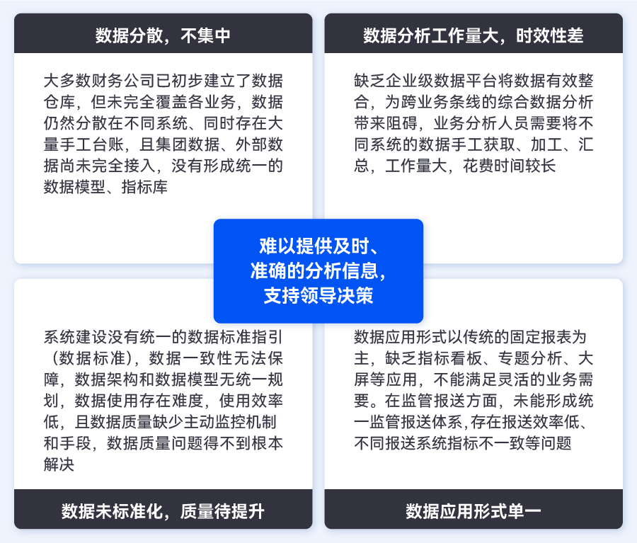 為了深挖數據價值、有效反哺業務,建立企業級大數據平臺,用以全面采集數據、標準化數據模型、統一指標體系、拓展數據應用場景,成為財務公司數字化轉型的必然選擇。