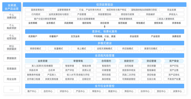 在業(yè)務(wù)應(yīng)用層面,以“雙客”(客戶經(jīng)理、客戶)為中心、線下產(chǎn)品線上化、場景數(shù)字化,對不同行業(yè)、類別、風(fēng)險等客戶提供差異化服務(wù),實現(xiàn)“千人千面”、“千人一面”,為客戶提供量身定制的信貸產(chǎn)品,滿足不同客戶群體的需求;通過無紙化、業(yè)務(wù)移動化、流程可視化,優(yōu)化信貸業(yè)務(wù)流程,簡化辦理流程,提升精細(xì)化管理水平;以業(yè)務(wù)邏輯劃分各個獨立又互相協(xié)作的能力中心,包括客戶中心、產(chǎn)品中心、定價中心、額度中心、審批中心、評級中心、押品中心、貸后中心、核算中心等,支持金融機構(gòu)以此為依托進行個人貸款、對公信貸、同業(yè)信貸、集團信貸、小微信貸、普惠業(yè)務(wù)、網(wǎng)貸業(yè)務(wù)(包括助貸、聯(lián)合貸、信用付)等各類貸款業(yè)務(wù)的產(chǎn)品創(chuàng)新和運營創(chuàng)新。