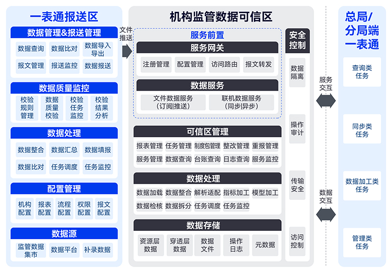 屏蔽底層技術細節(jié):通過服務前置提供標準的服務接口,打通監(jiān)管端和機構(gòu)監(jiān)管可信區(qū),從而屏蔽機構(gòu)端的底層存儲和技術差異,實現(xiàn)服務交互和數(shù)據(jù)交互。