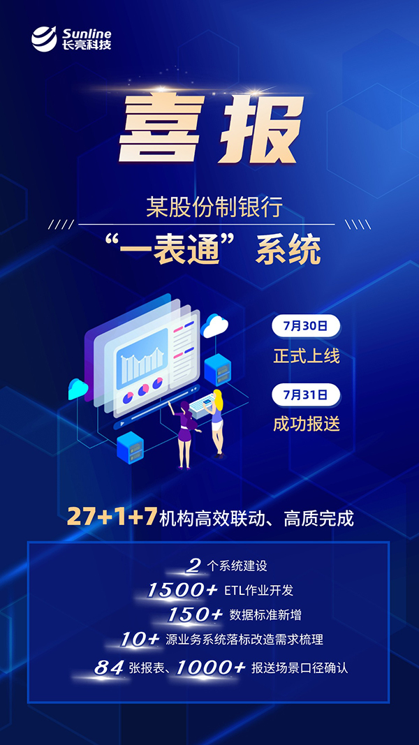 7月31日,某股份制銀行與長亮科技共建的“一表通”系統正式上線,并順利完成2.0版月報數據(6月)和2.0版日報數據(7月23日-27日)的報送工作。