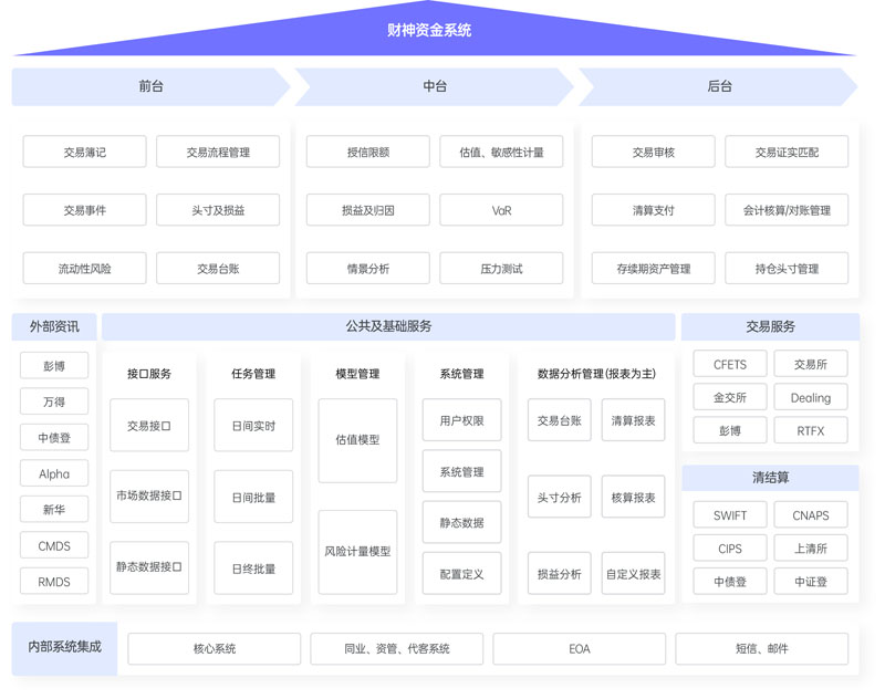 為金融機構(gòu)資金業(yè)務條線打造專業(yè)的、最大化自主可控的資金前中后一體化資產(chǎn)信息系統(tǒng),提供從前臺交易,中臺風險,到后臺清算核算、報表統(tǒng)計等各項功能。