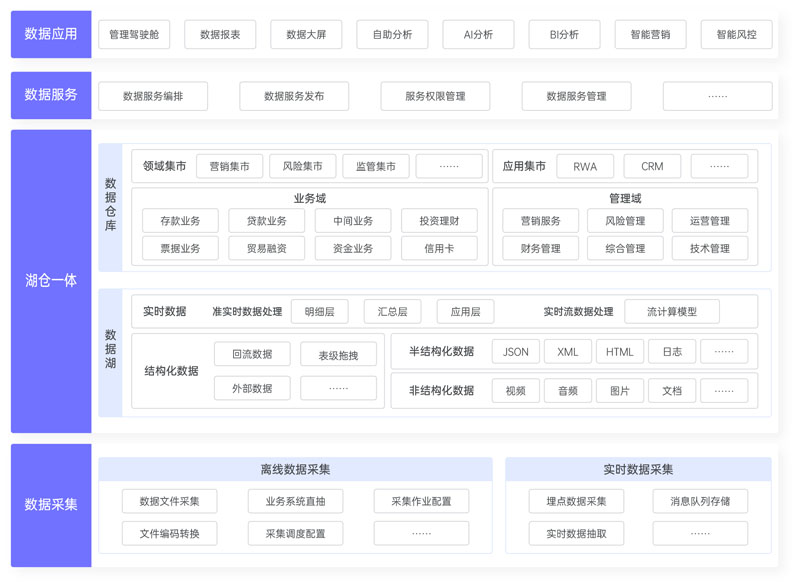 融合數(shù)據(jù)湖與數(shù)據(jù)倉庫的優(yōu)勢,形成一體化的數(shù)據(jù)底層平臺,通過湖倉一體技術(shù),使得數(shù)據(jù)平臺底層支持多數(shù)據(jù)類型統(tǒng)一存儲,實現(xiàn)數(shù)據(jù)在數(shù)據(jù)湖、數(shù)據(jù)倉庫之間無縫調(diào)度和管理,并實現(xiàn)統(tǒng)一數(shù)據(jù)服務(wù)以支撐數(shù)據(jù)應(yīng)用及分析。