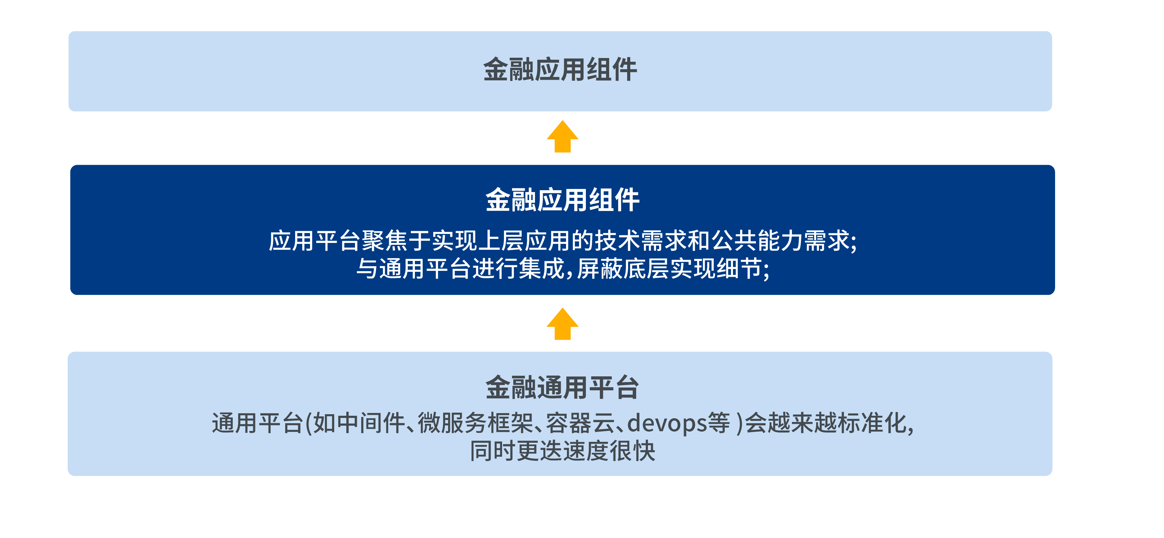 在新一代金融應用平臺演進中,通用平臺(包括中間件、微服務框架等通用類組件)與應用平臺(面向金融應用的開發(fā)運行框架和公共能力)的分離已經成為一種趨勢。因為專業(yè)性、擴展性、演變路線和解決問題域的不同,應用平臺將更聚焦于應用場景業(yè)務知識的沉淀(公共能力下沉),未來也有可能逐步演變成應用中臺,而通用平臺更關注企業(yè)級可復用組件,或逐漸演變成技術中臺。
