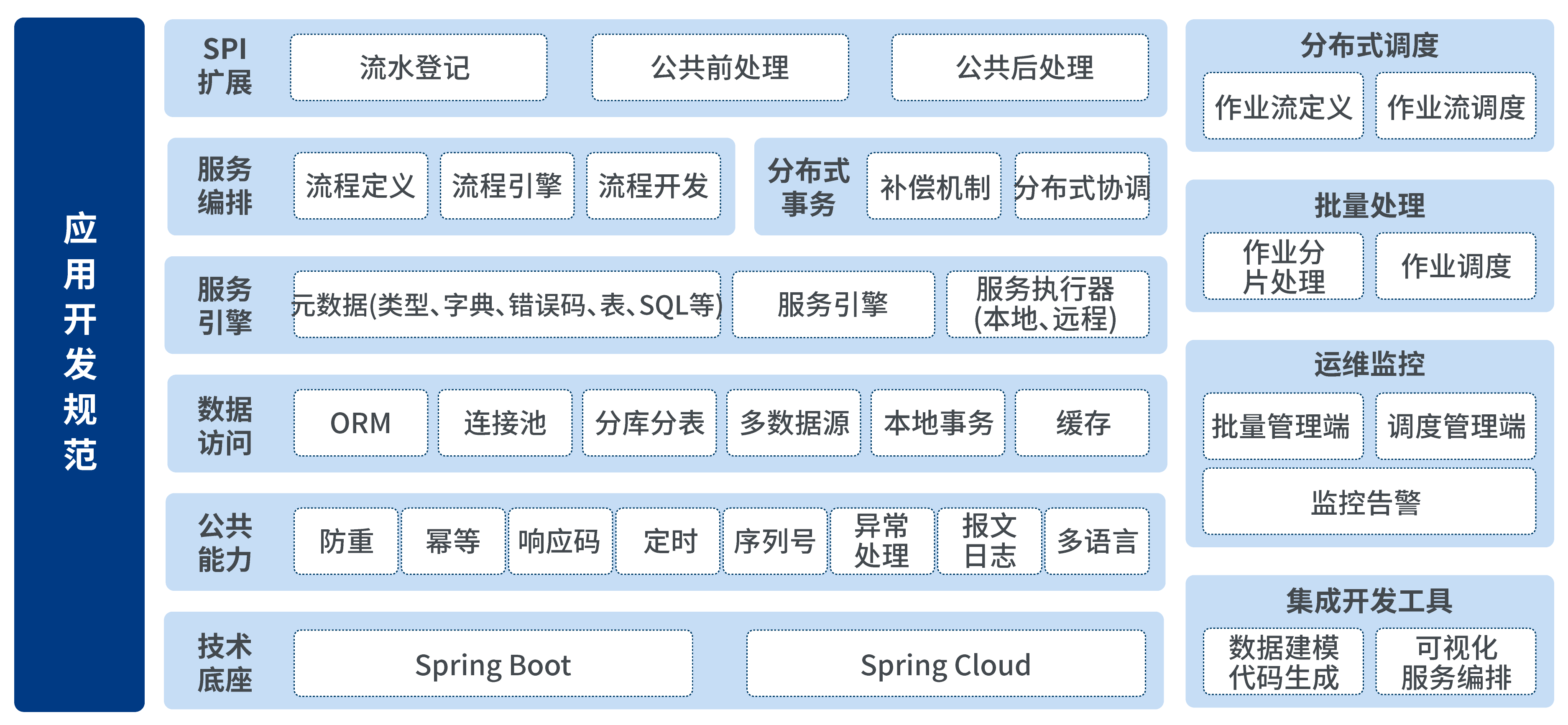 新一代金融應用平臺總體架構由聯(lián)機引擎(服務引擎、服務編排、分布式事務、元數據等)、批量引擎(分布式調度、批量處理)、公共能力(防重、冪等、序列號、數據訪問、SPI機制、技術底座等)、開發(fā)工具和開發(fā)規(guī)范組成。