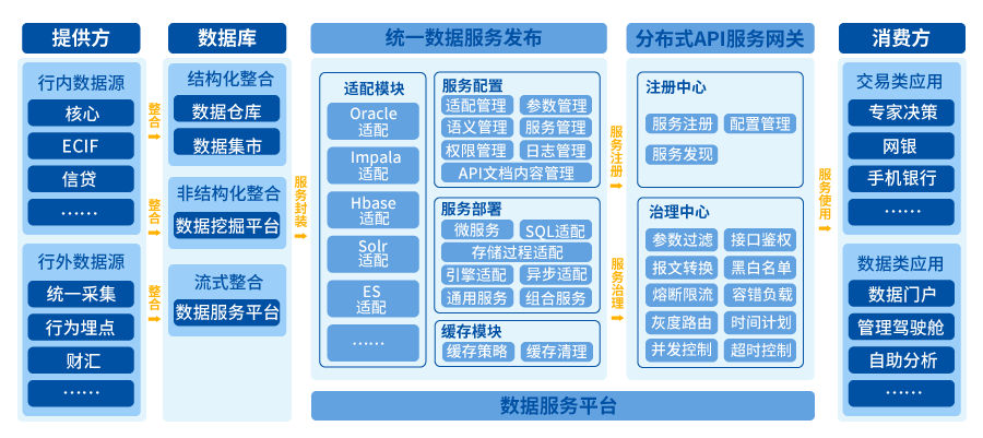 通過數(shù)據(jù)服務平臺,金融機構可實現(xiàn)對服務進行在線的可視化服務編排,減少重復開發(fā),降低接口管理成本,快速為業(yè)務賦能,真正實現(xiàn)數(shù)據(jù)服務化。