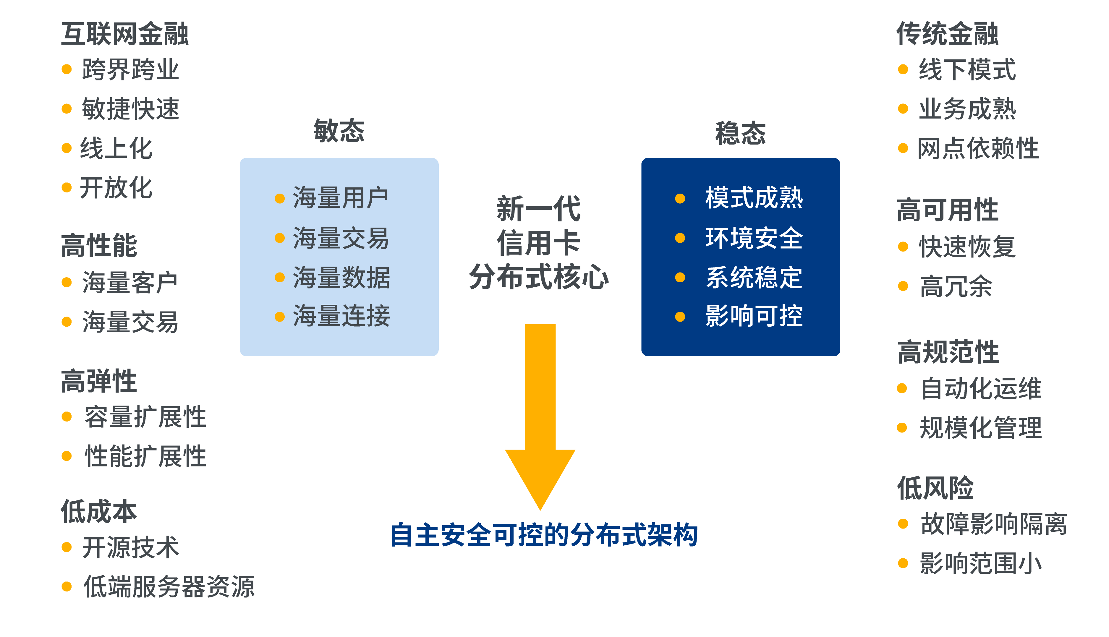 架構(gòu)設(shè)計(jì)時(shí)基于國(guó)產(chǎn)數(shù)據(jù)庫(kù),依托于自主、安全、可靠的分布式架構(gòu),充分考慮移動(dòng)互聯(lián)網(wǎng)端的海量數(shù)據(jù),以靈活的業(yè)務(wù)建模體系,驅(qū)動(dòng)微服務(wù)化拆分,實(shí)現(xiàn)銀行金融的穩(wěn)態(tài)傳統(tǒng)與數(shù)字經(jīng)濟(jì)的敏態(tài)特色相結(jié)合,具有高擴(kuò)展性、高處理效率、高彈性等特點(diǎn),使得銀行信用卡業(yè)務(wù)能夠快速創(chuàng)新、快速試錯(cuò)、快速迭代。