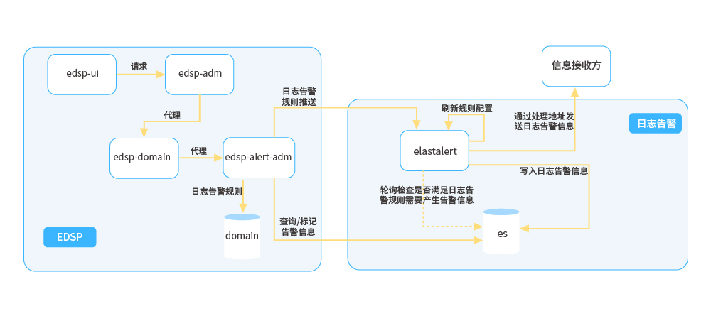 ● 日志告警:通過管控端配置告警規(guī)則提交到告警管理模塊落庫持久化,同時(shí)將告警規(guī)則推送至日志告警組件,然后刷新本地告警規(guī)則配置并定時(shí)輪詢檢測日志數(shù)據(jù)是否觸發(fā)告警規(guī)則,隨后產(chǎn)生相關(guān)告警事件,并將告警事件持久化,同時(shí)推送至告警推送系統(tǒng)進(jìn)行下一步推送操作。