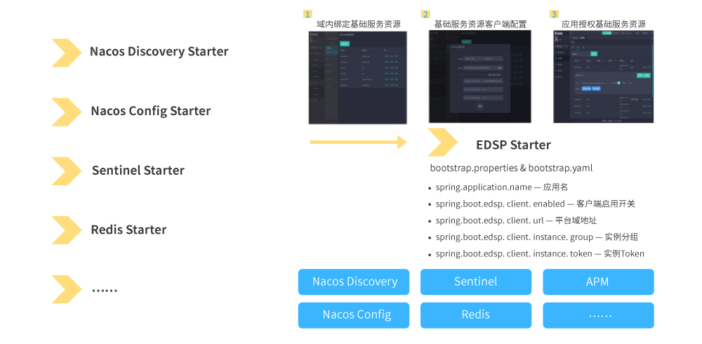 ■ 將業(yè)務(wù)應(yīng)用集成這些基礎(chǔ)組件所需要的各種客戶端Starter包裝成一個(gè)簡單且統(tǒng)一的客戶端Starter,利用Spring Boot內(nèi)置的監(jiān)聽器機(jī)制,在業(yè)務(wù)應(yīng)用啟動(dòng)時(shí)可以連接到平臺上以此來獲取連接這些組件資源所需要的各種參數(shù),在這個(gè)過程中也可以通過Token機(jī)制實(shí)現(xiàn)對組件資源的訪問權(quán)限控制,即降低了業(yè)務(wù)應(yīng)用集成這些基礎(chǔ)組件的配置參數(shù)管理難度,也提高了對基礎(chǔ)組件使用的安全管控能力。