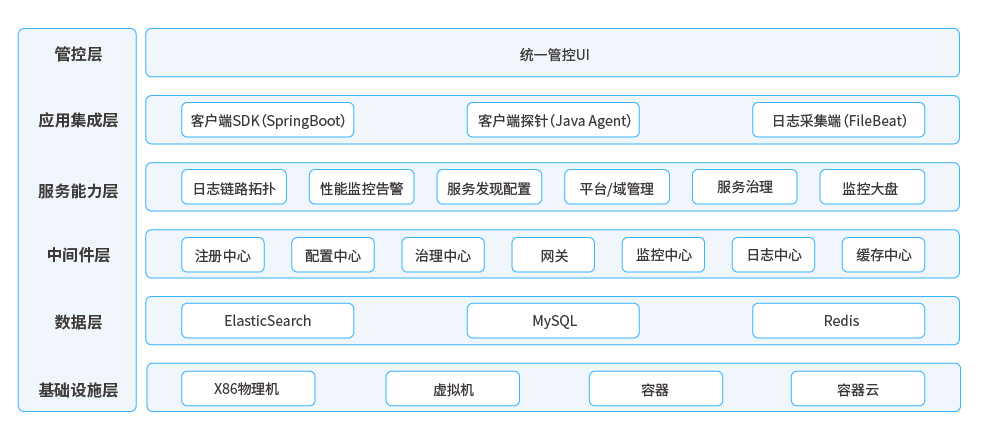 ● 集成層:主要針對微服務(wù)應(yīng)用提供治理服務(wù)集成能力,主要包括客戶端集成SDK、客戶端性能和鏈路探針、客戶端日志收集代理;