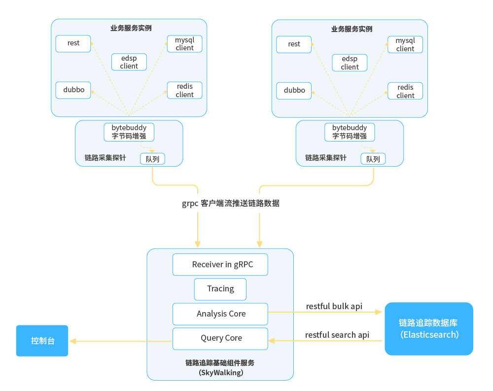 ● 鏈路追蹤:與性能監(jiān)控探針技術(shù)類似,利用Java探針技術(shù),遵循OpenTracing標(biāo)準(zhǔn),收集全鏈路數(shù)據(jù),并分析鏈路數(shù)據(jù)形成調(diào)用拓?fù)洌粦?yīng)用實(shí)例通過平臺SDK注冊到平臺獲取到APM組件信息,通過APM組件客戶端對APM組件進(jìn)行相關(guān)初始化操作,之后依托Agent字節(jié)碼增強(qiáng)技術(shù)在相應(yīng)位置進(jìn)行埋點(diǎn),定時(shí)將鏈路數(shù)據(jù)推送至APM組件進(jìn)行分析并持久化,同時(shí)將MDC信息填充到日志,從而實(shí)現(xiàn)鏈路與日志的聯(lián)動(dòng);平臺本身通過訪問APM組件暴露的端點(diǎn)獲取相關(guān)鏈路數(shù)據(jù)。