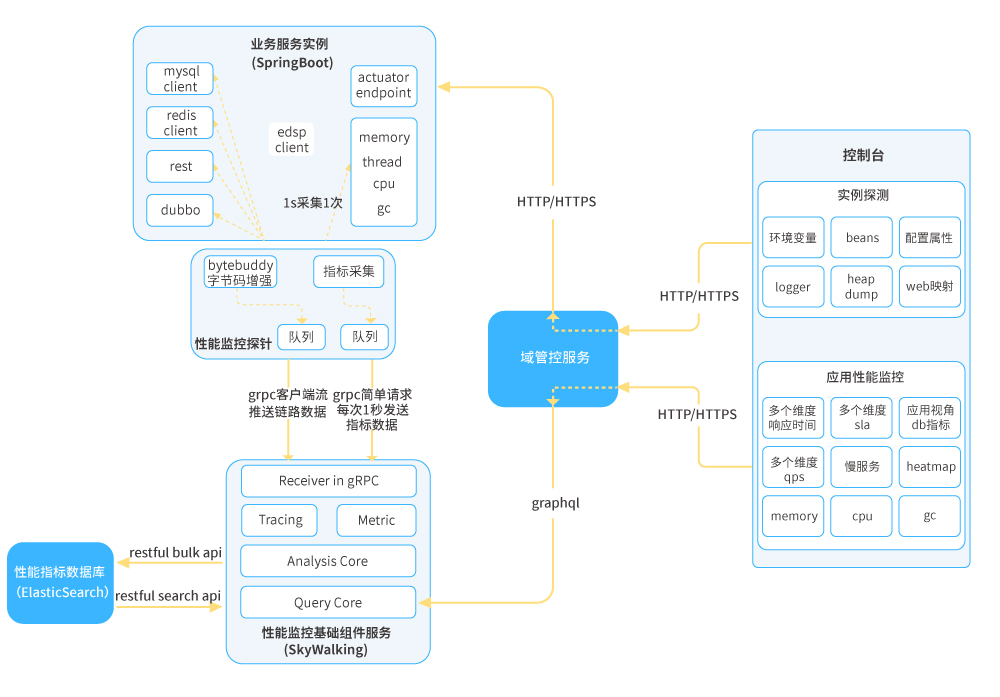 ● 性能監(jiān)控:為了實(shí)現(xiàn)對業(yè)務(wù)應(yīng)用的零代碼侵入,可采用Java探針技術(shù)實(shí)現(xiàn)對微服務(wù)應(yīng)用的性能數(shù)據(jù)采集,如Skywalking APM Agent;從應(yīng)用、集群、端口等維度收集性能數(shù)據(jù),性能數(shù)據(jù)包括但不局限于:服務(wù)可用級別、響應(yīng)時(shí)間、每分鐘調(diào)用數(shù)、百分位響應(yīng)耗時(shí)、CPU、內(nèi)存、GC情況等。應(yīng)用實(shí)例通過平臺SDK注冊到平臺獲取到APM組件信息,通過APM組件客戶端對APM組件進(jìn)行相關(guān)初始化操作,之后依托Agent字節(jié)碼增強(qiáng)技術(shù)在相應(yīng)位置進(jìn)行埋點(diǎn),定時(shí)將性能數(shù)據(jù)推送至APM組件進(jìn)行分析并持久化;平臺本身通過訪問APM組件暴露的端點(diǎn)獲取相關(guān)性能數(shù)據(jù)。