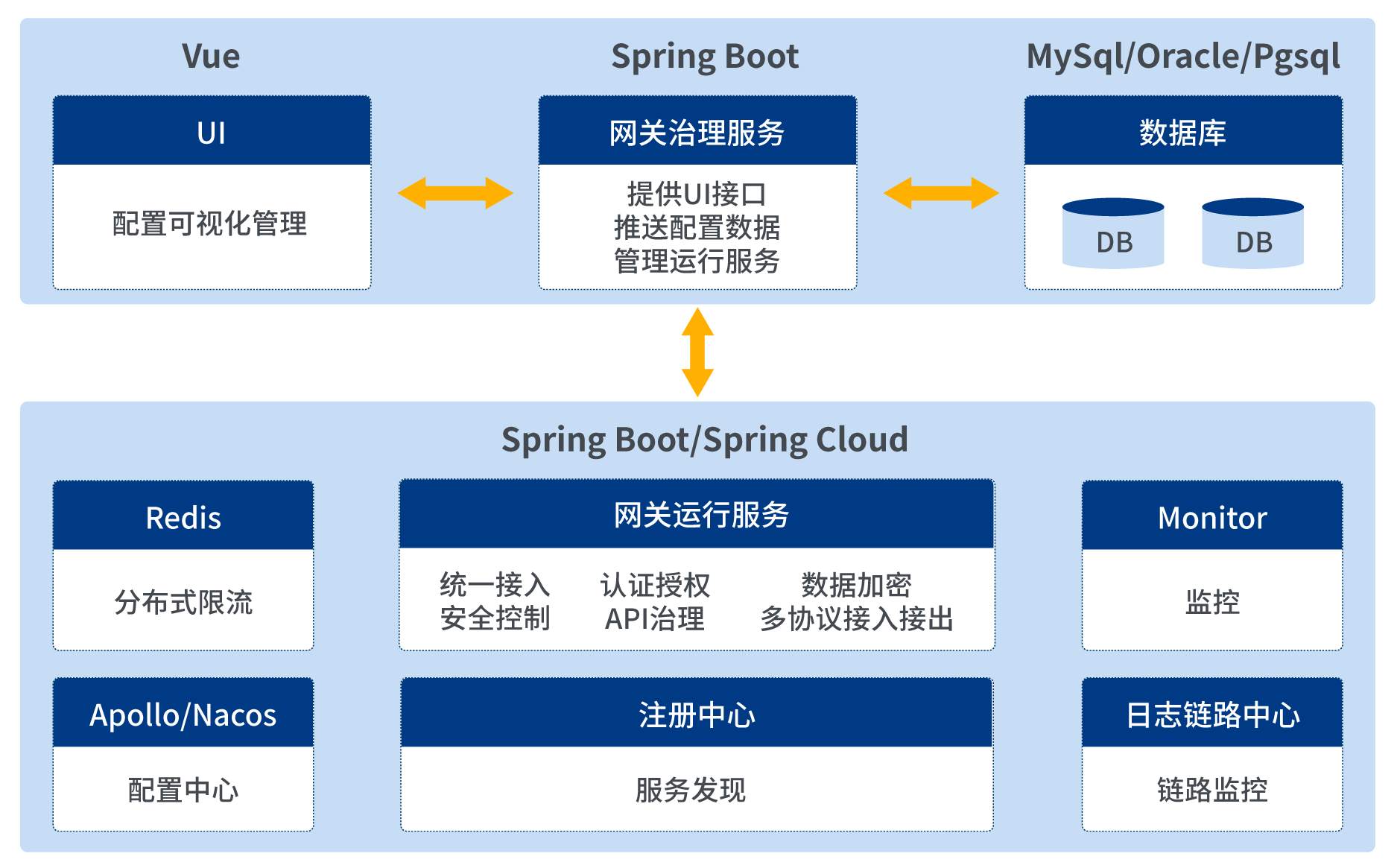 API網關采用前后端分離架構模式,以Java語言開發,選用當前主流技術棧Spring Boot,Spring Cloud體系。